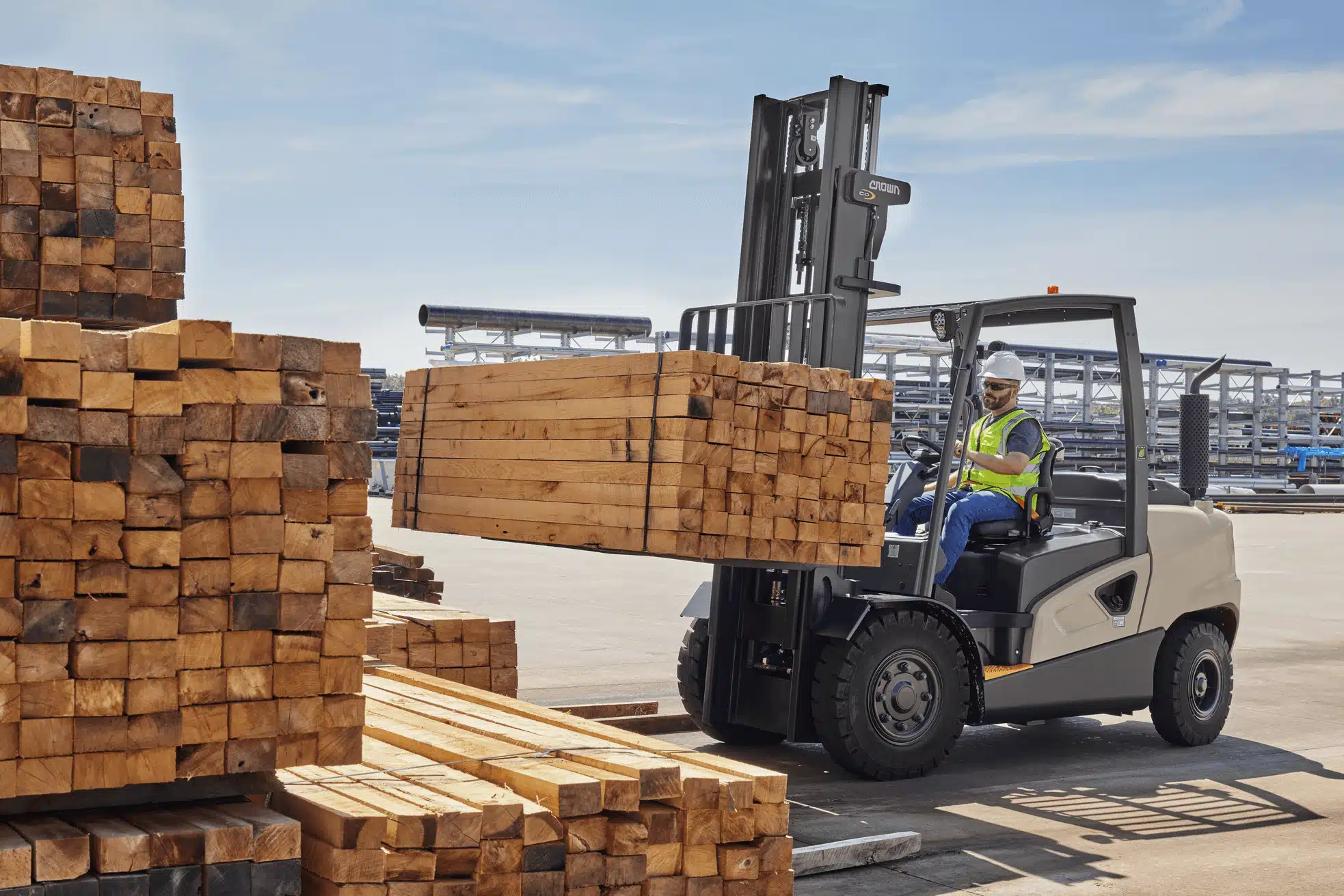 Os empilhadores de combustão Crown oferecem soluções adaptáveis a múltiplos cenários, desde docas de carga até pátios exteriores. Estão disponíveis em várias capacidades, configurações e séries, podendo ser equipados com cabines e acessórios específicos para otimizar o manuseamento de cargas.