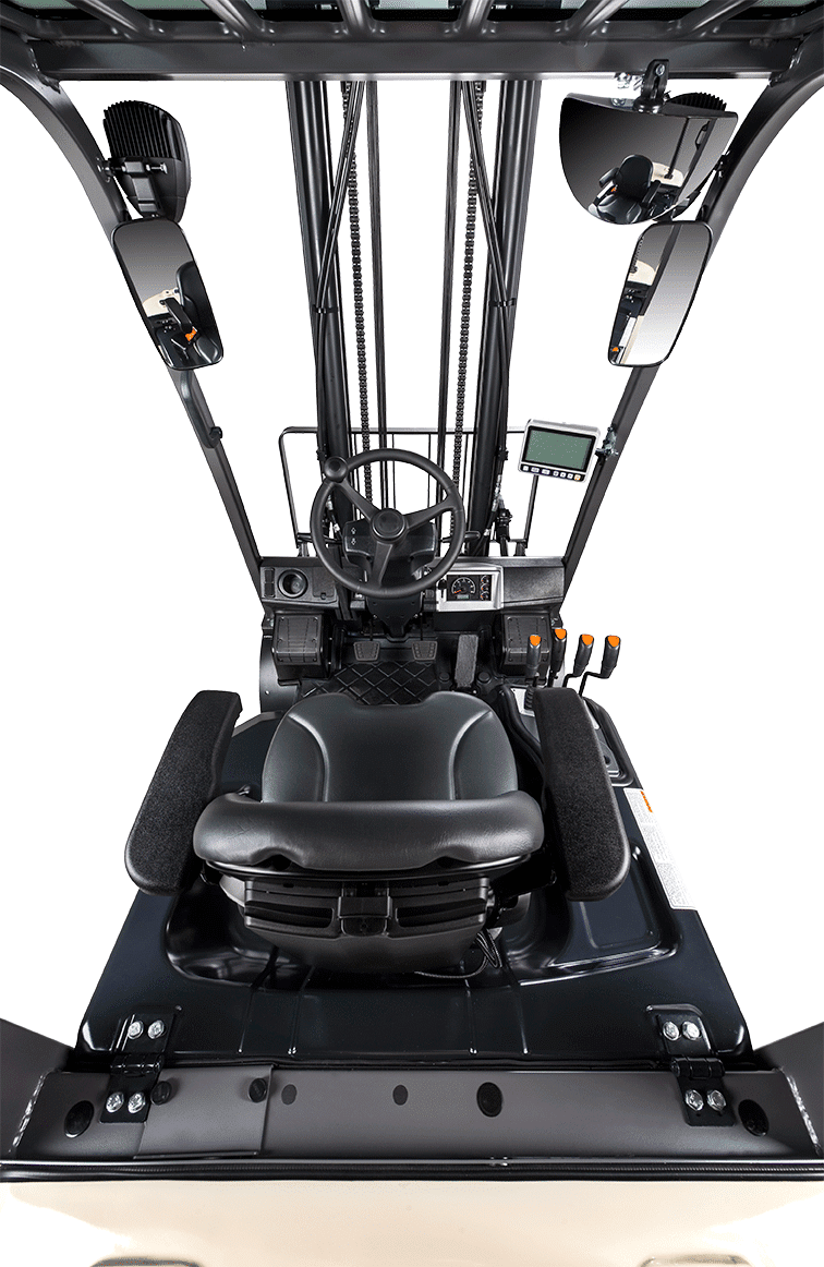 • Conforto do operador: cabina ergonómica com coluna de direção ajustável, piso amplo, visibilidade otimizada e display LCD