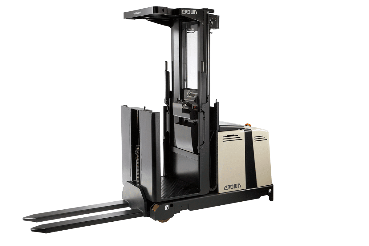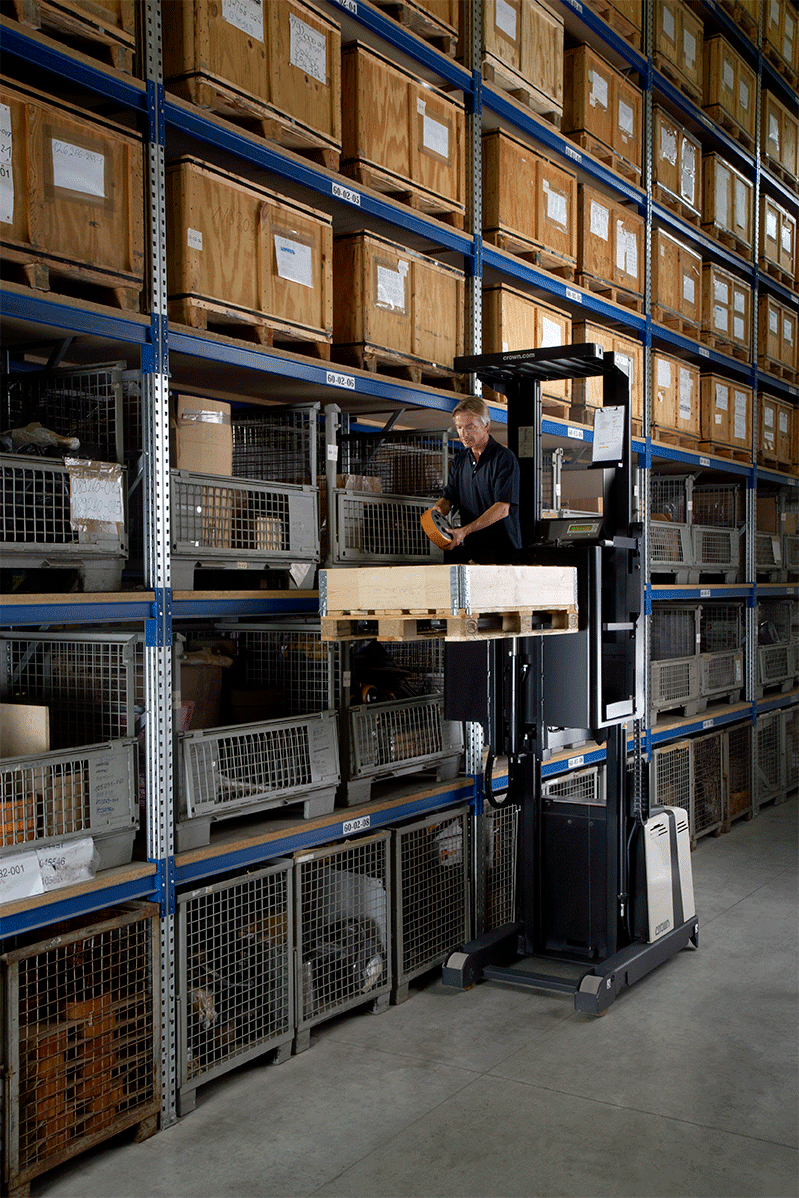 Preparador de pedidos de alta elevação Crown Série SP 1500 com cabine elevatória até 9.600 mm. Ideal para picking em grandes alturas, armazéns verticais e corredores estreitos com elevada densidade de armazenamento.